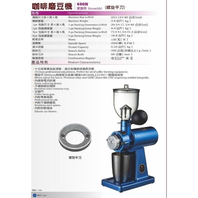 飛馬楊家 飛馬磨豆機 690N 螺旋平刀 藍/白/黑 細粉少 層次佳 防靜電