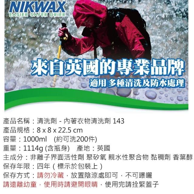 NIKWAX 內著衣物清洗劑 143(1000ml) 野外營 吸濕排汗專業清洗 去除異味 運動服飾專用洗劑
