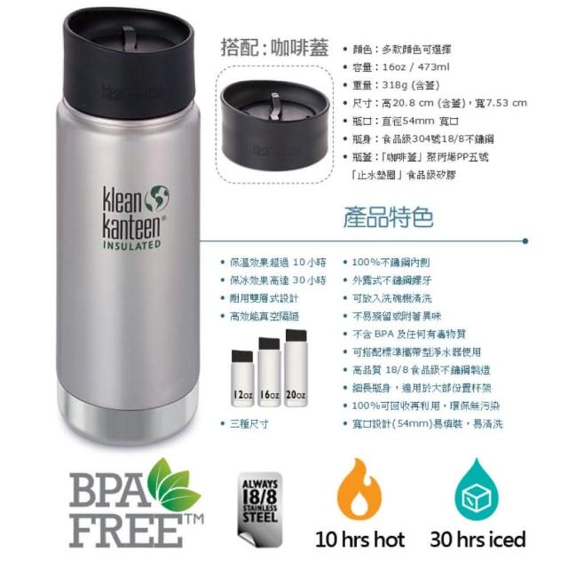 Klean Kanteen出清特價 16oz寬口保溫瓶附咖啡蓋 K16VWPCC 野外營 473ml 保溫瓶