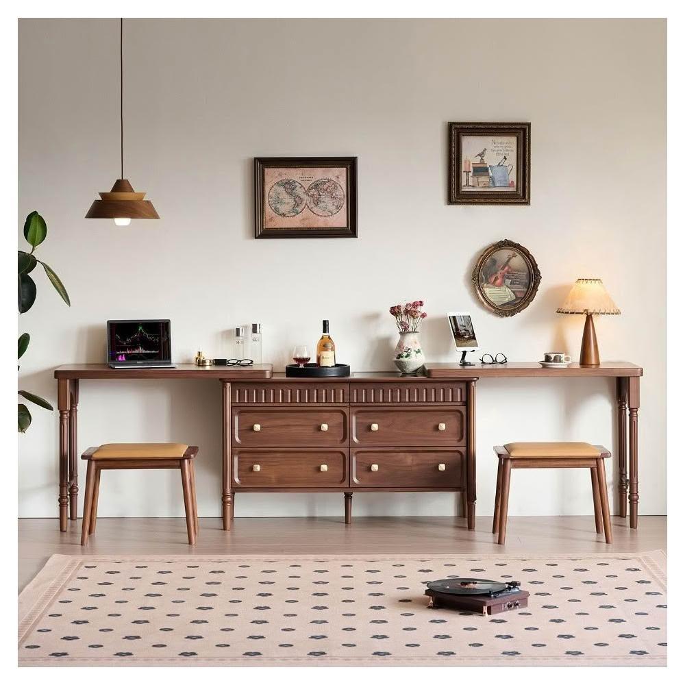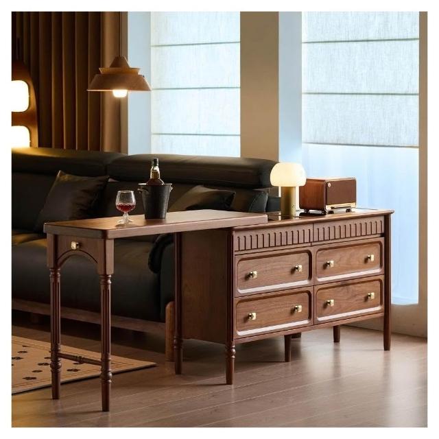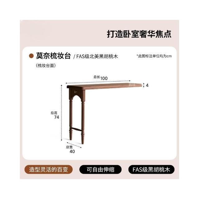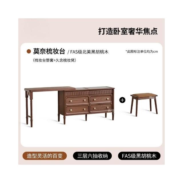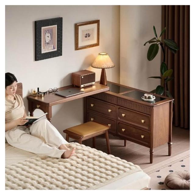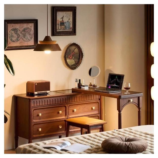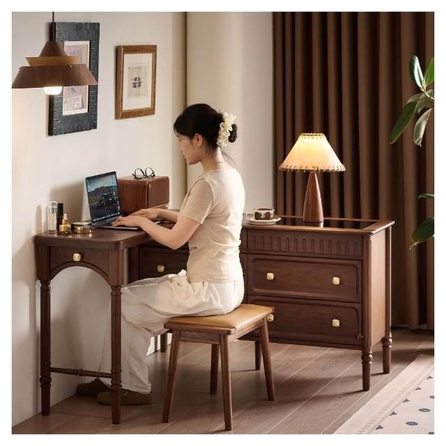 奶油風 梳妝台 化妝台 化妝桌 北美黑胡桃木梳妝台斗櫃一體法式復古可伸縮臥室中古實木化妝桌子
