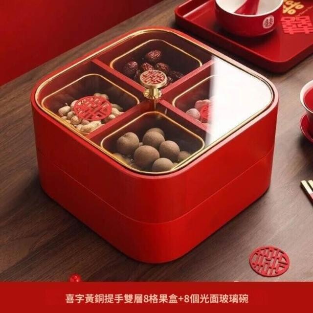 新中式實木紅色喜慶糖果盒家用客廳幹果盤新年結婚喬遷零食收納盒