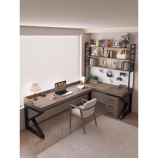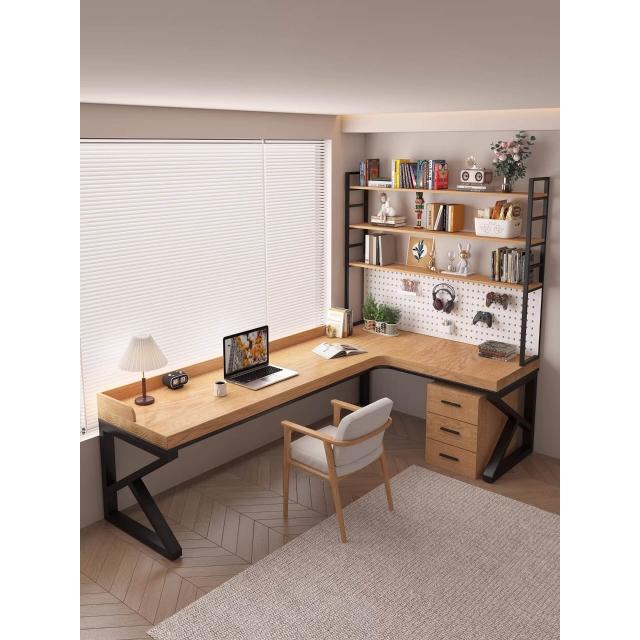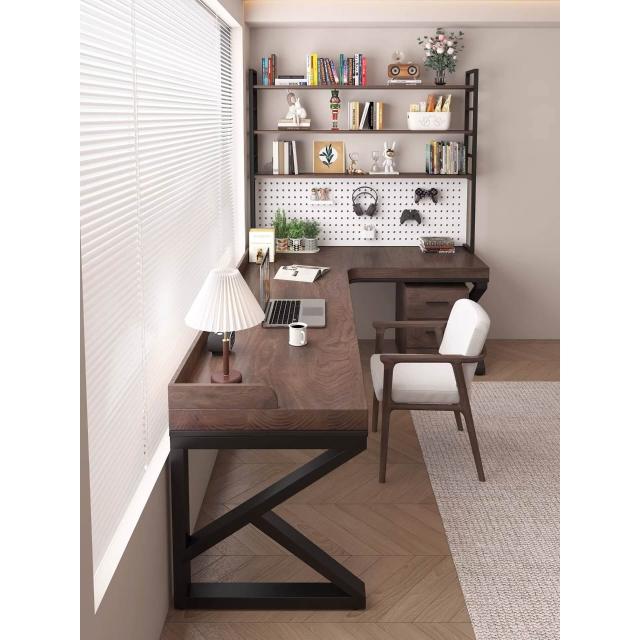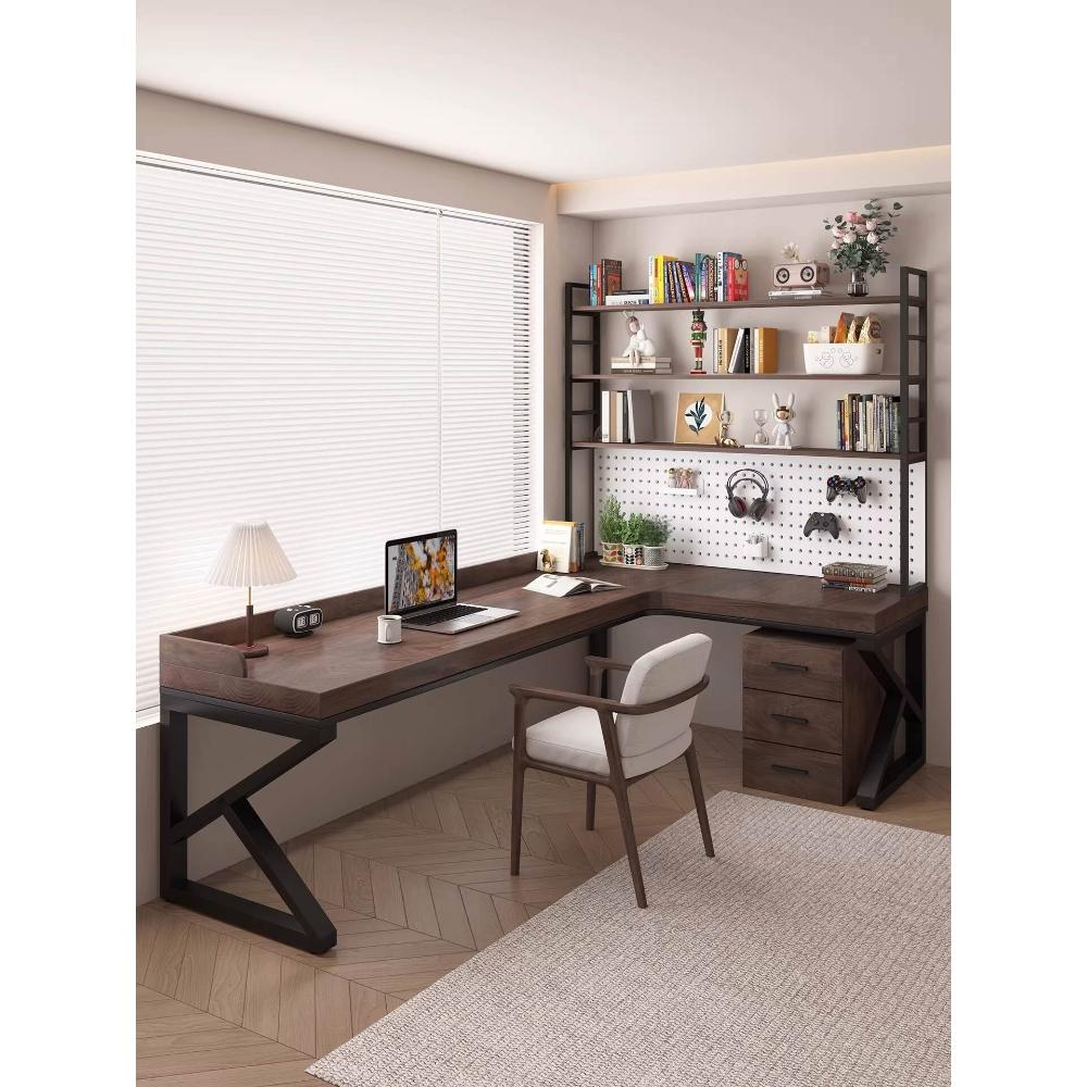 含稅/免運 純實木轉角書桌書架一體家用雙人L型電腦桌臥室辦公桌7學習工作臺