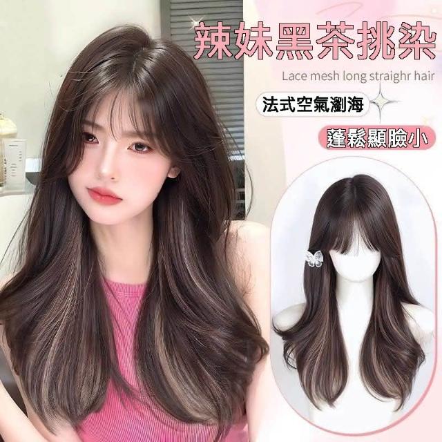 黑茶挑染 假髮女款巴黎畫染長捲髮辣妹挑染時尚仿真髮頭套黑茶微捲假髮