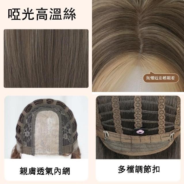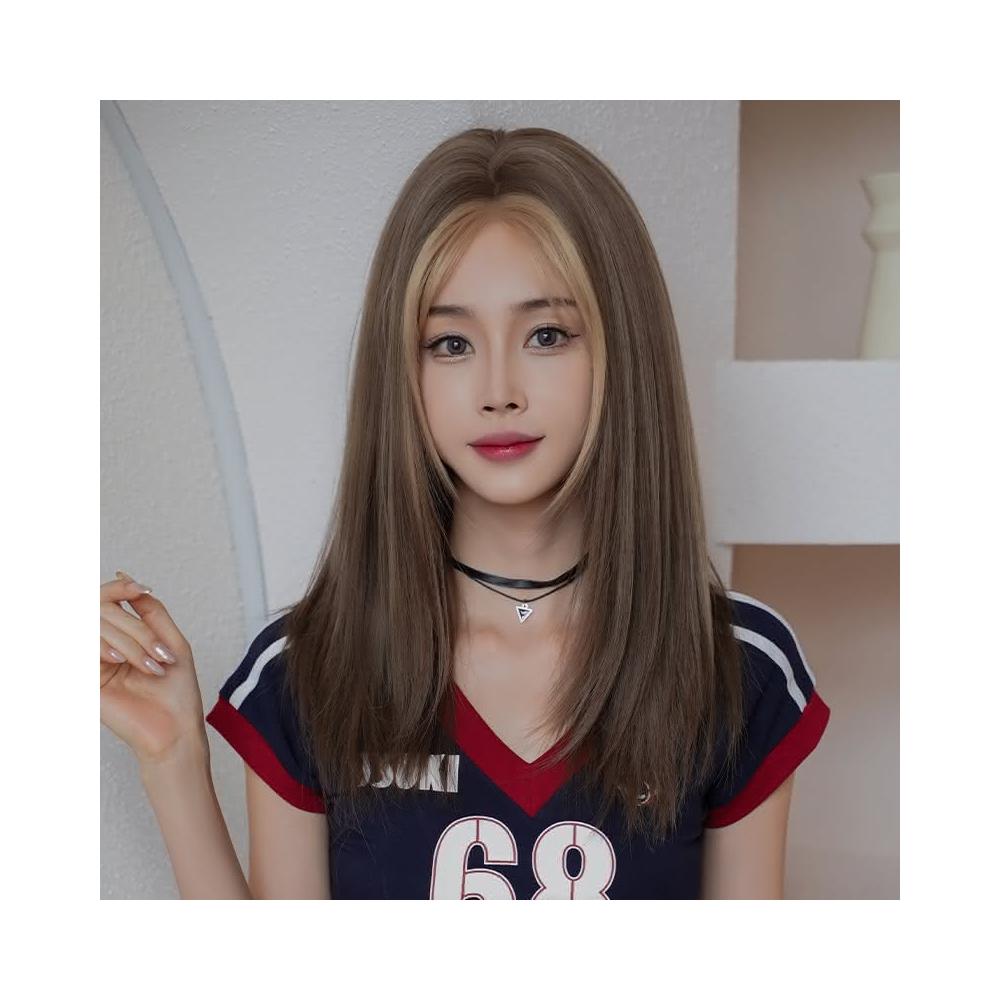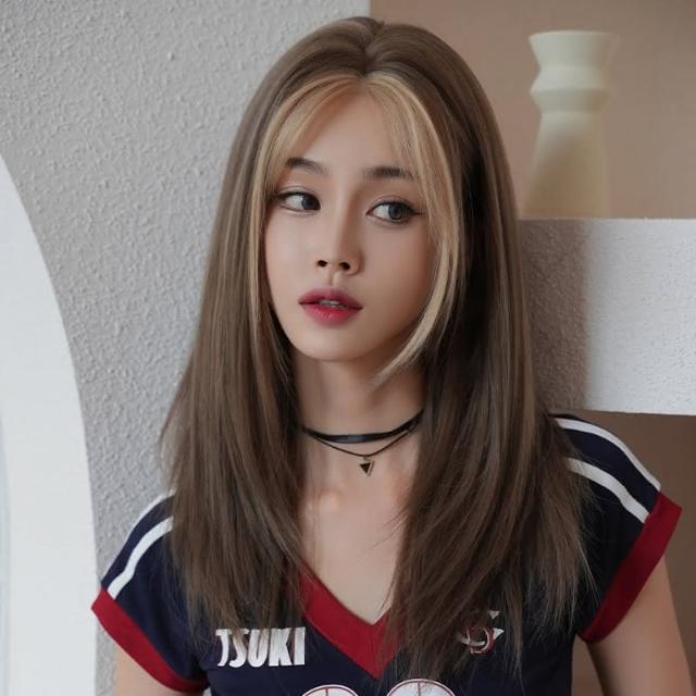 假髮女長直髮灰棕頭頂染整頂全頭套前額一字手織化纖仿真中分長髮