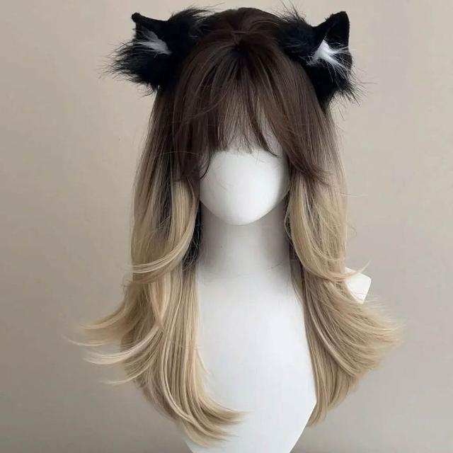 暹羅貓髮色 假髮女中長髮漸層巧克力色爆頂染高層次髮尾微捲全頭套