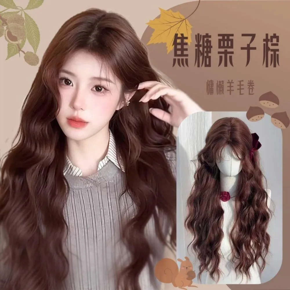 焦糖栗棕色 整頂假髮 假髮 空氣劉海 假髮女wig 假髮 長捲假髮 羊毛捲假髮 女生假髮 假頭髮