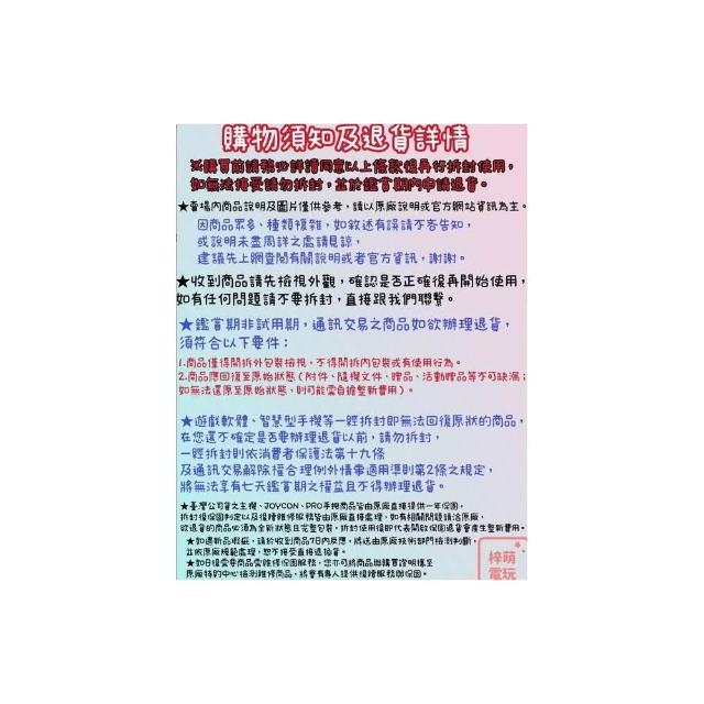 - 商品到貨享十天猶豫期之權益(注意!猶豫期非試用期),依法辦理退貨商品必須是全新狀態且包裝完整(包含主機、附件、內外包裝、隨機文件、贈品等)。如商品一經拆封或使用致商品價值受損(例僅得以福利品出售),商店將向消費者就商品一部或全部價值減損收取適當之費用(回復原狀、整新費),否則將影響退貨的權限。請先確認商品正確、外觀可接受,再行開機/使用,以免影響您的權利,祝您購物順心。