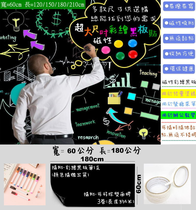 MIT磁性軟白板貼/彩繪黑板貼(60cmX180cm)磁鐵可吸/環保無毒/可重複使用/可彎曲/可剪裁/白板/黑板//牆貼