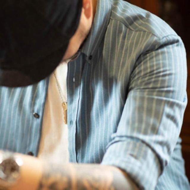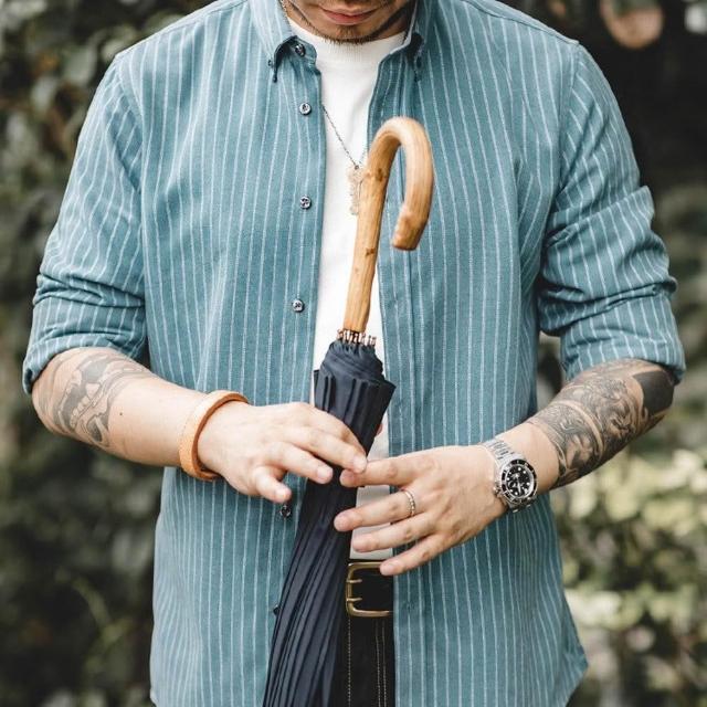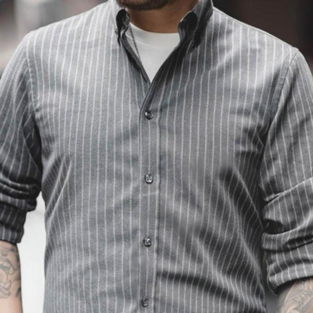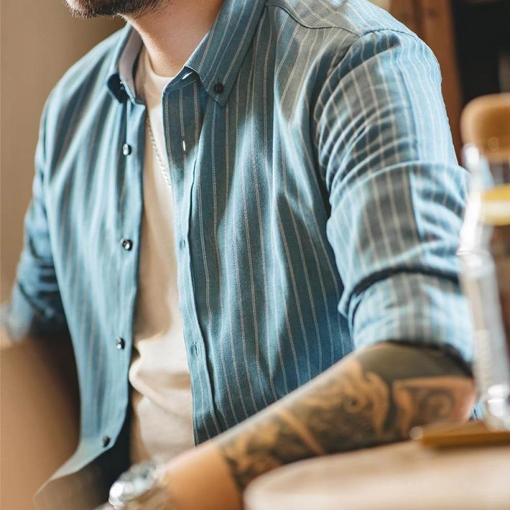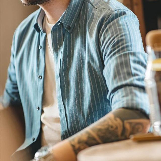 馬登工裝美式復古磨毛藍色豎條紋襯衫商務休閑長袖免燙襯衣