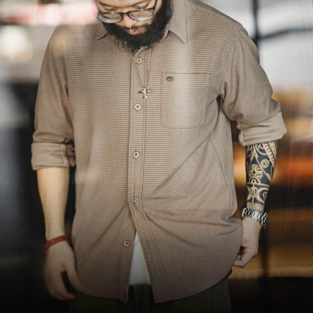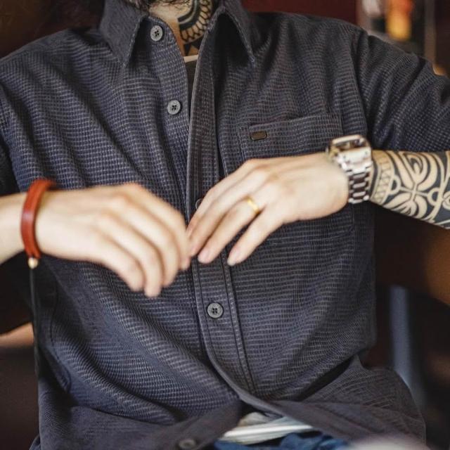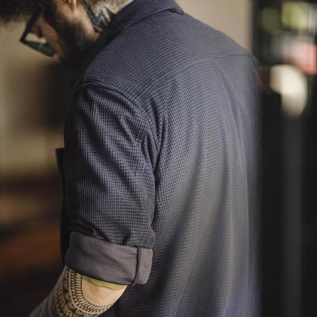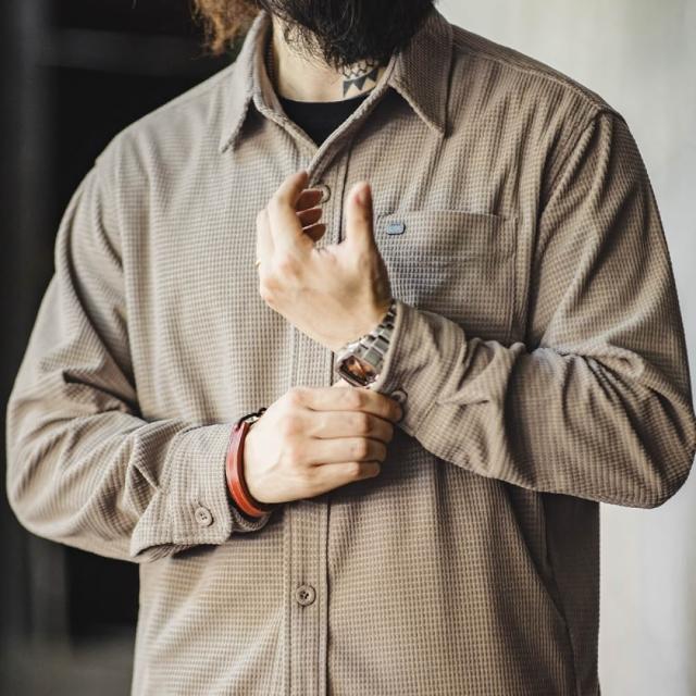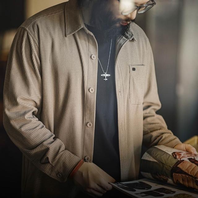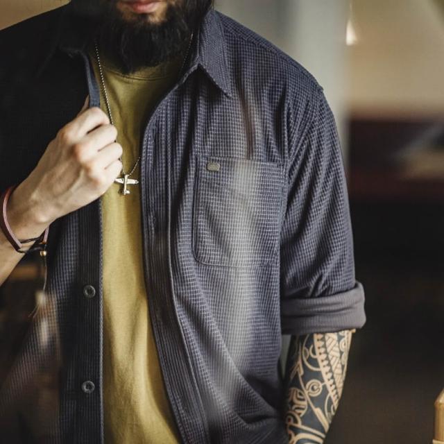 馬登工裝美式復古玉米粒格子襯衫翻領純色休閒鬆弛感長袖襯衣男秋