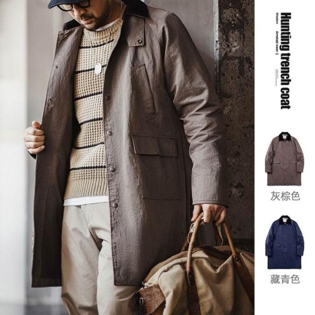 馬登工裝美式復古oversize獵裝風衣寬鬆翻領單排扣中長款外套男秋