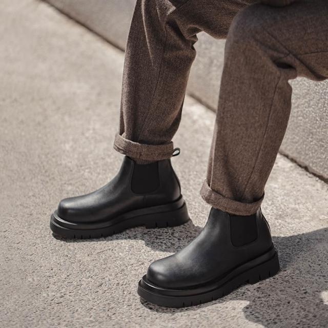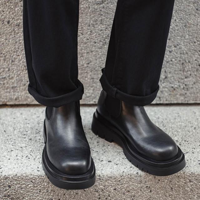 馬登工裝切爾西靴德比鞋男秋冬一脚蹬厚底增高休閒黑色真皮短靴馬丁靴
