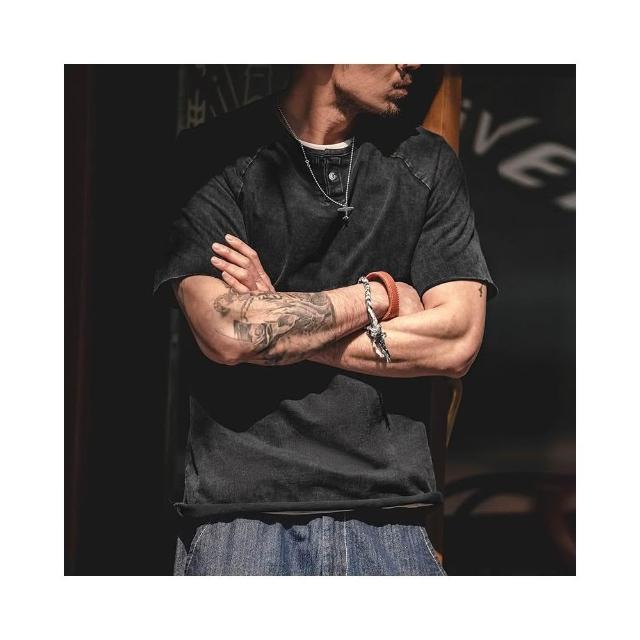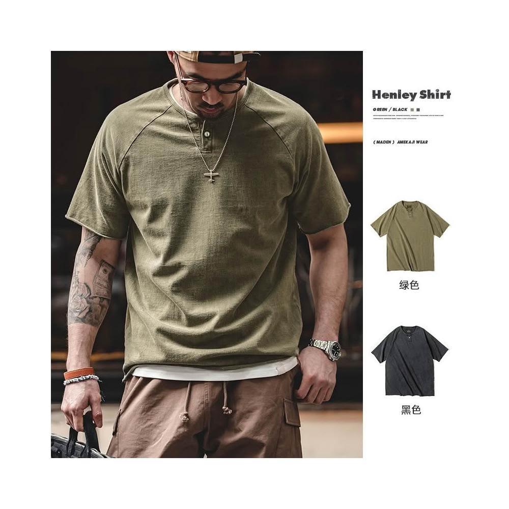 馬登工裝美式做舊亨利衫透氣休閒短袖阿美咔嘰硬漢t恤男潮夏