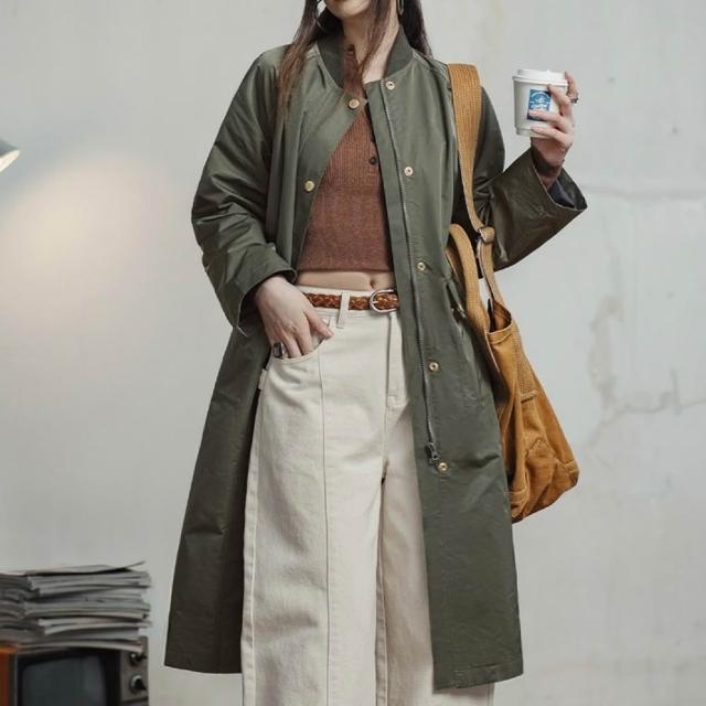 馬登工裝復古橄欖綠風衣中長款高級感大衣寬鬆翻蓋口袋工裝外套春秋女