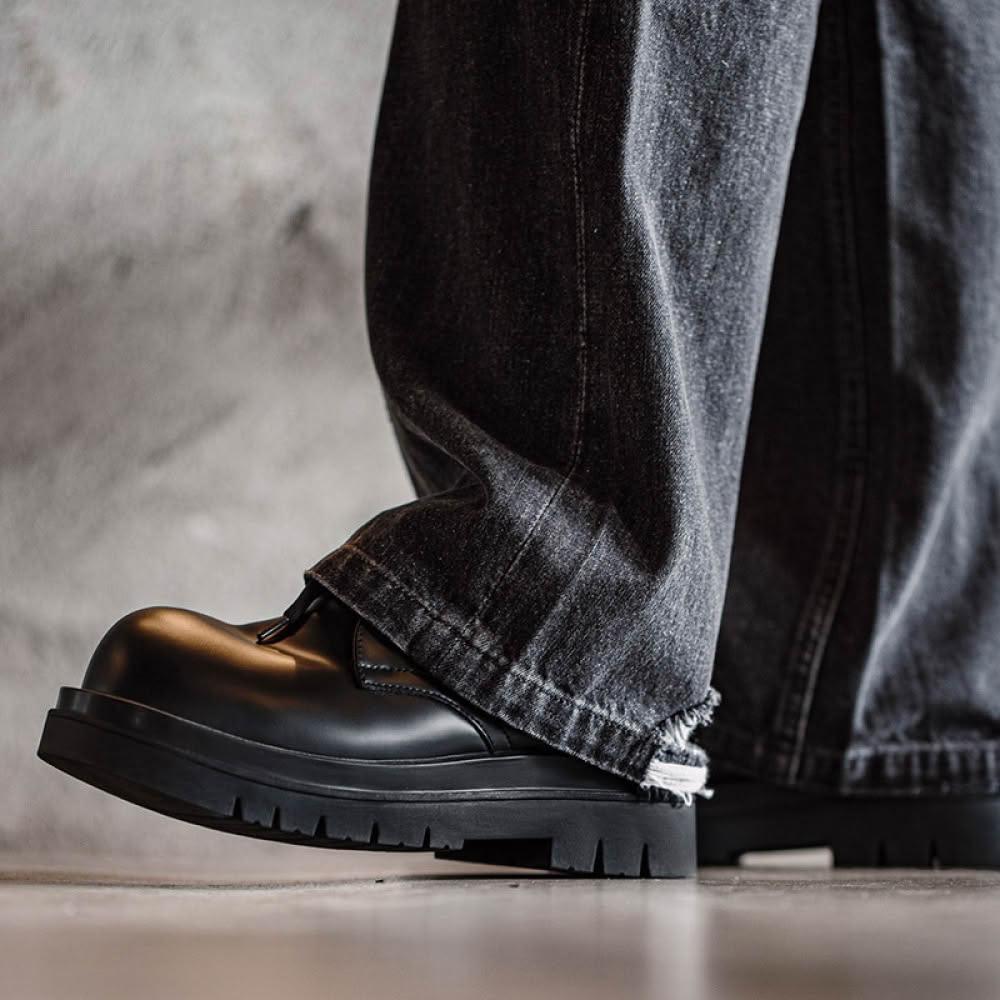 馬登工裝德比鞋男款厚底增高黑色大頭圓頭通勤休閒皮鞋(頭層牛皮)