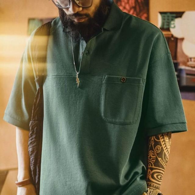 馬登工裝美式復古綠色polo衫短袖重磅寬鬆學院風翻領半袖t恤男夏
