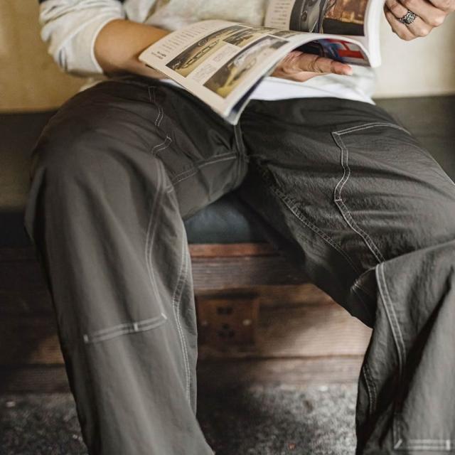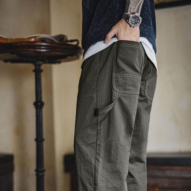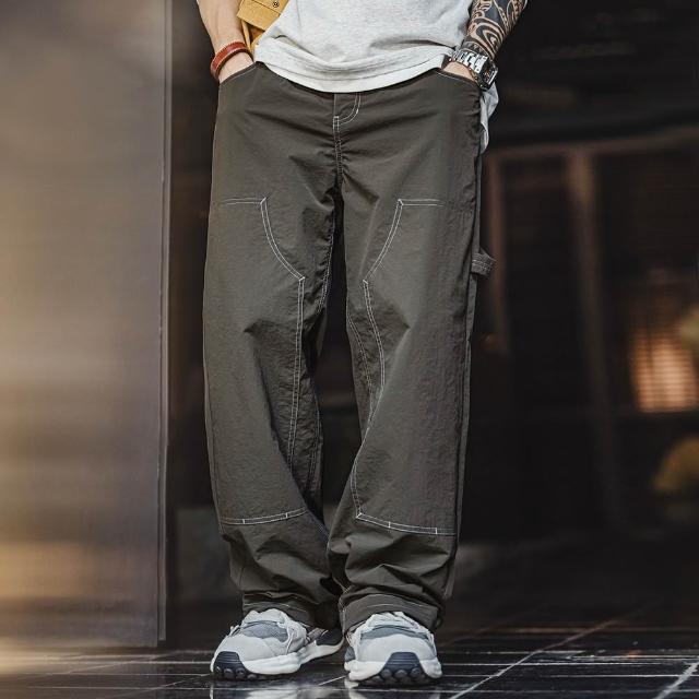 馬登工裝輕美式休閒雙膝伐木褲肌理感薄款垂感軍綠色長褲子男夏秋