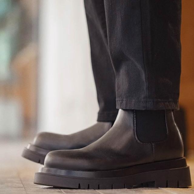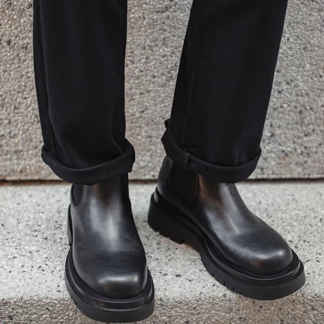 馬登工裝切爾西靴男款夏季一脚蹬厚底休閒黑色真皮短靴子方頭馬丁靴