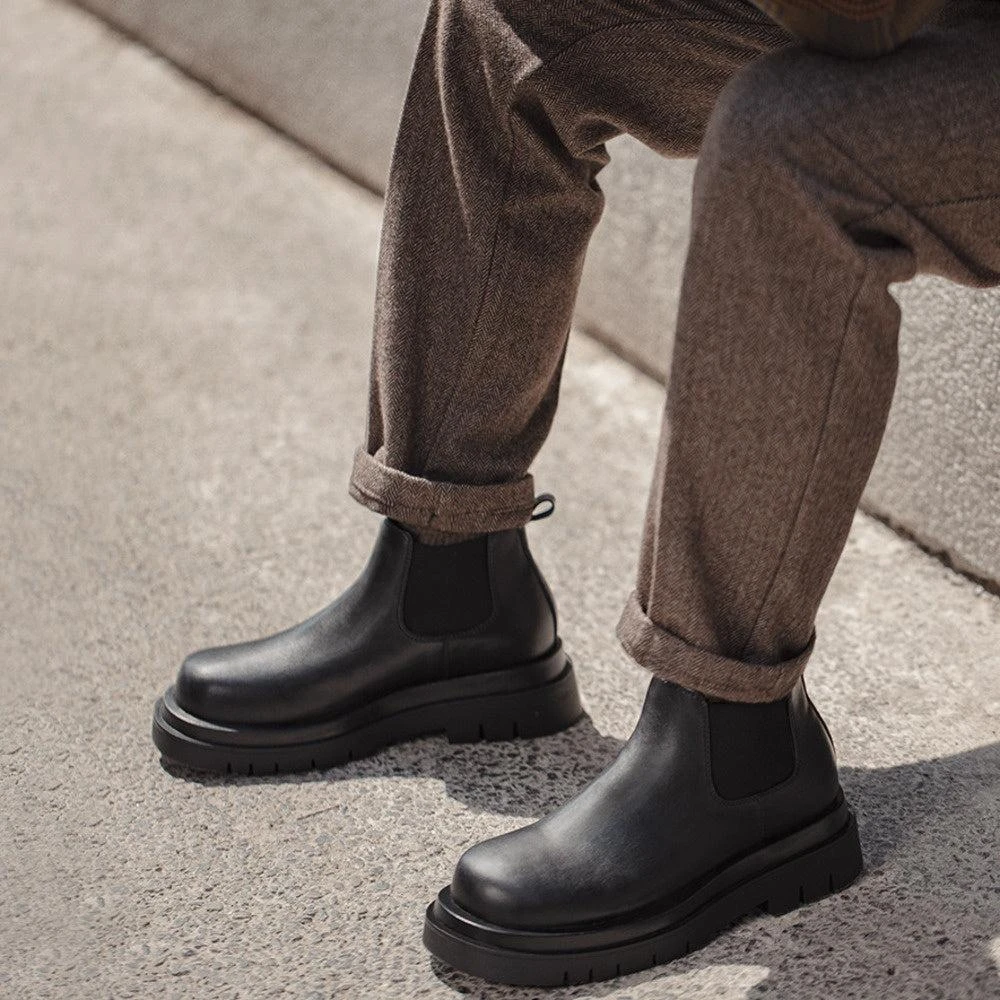 馬登工裝切爾西靴男款夏季一脚蹬厚底休閒黑色真皮短靴子方頭馬丁靴