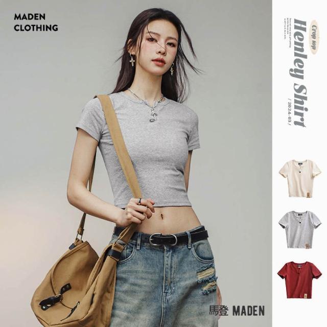 馬登工裝美式亨利衫短袖正肩修身T恤短款純色內搭打底衫棉辣妹上衣