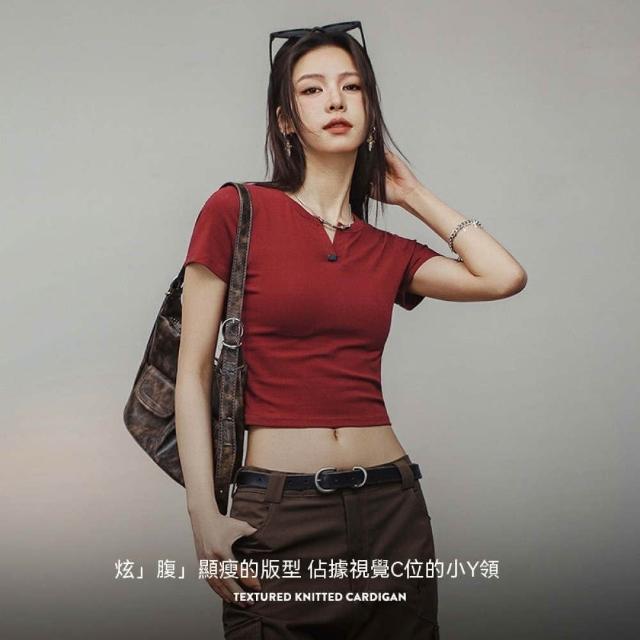 馬登工裝美式亨利衫短袖正肩修身T恤短款純色內搭打底衫棉辣妹上衣