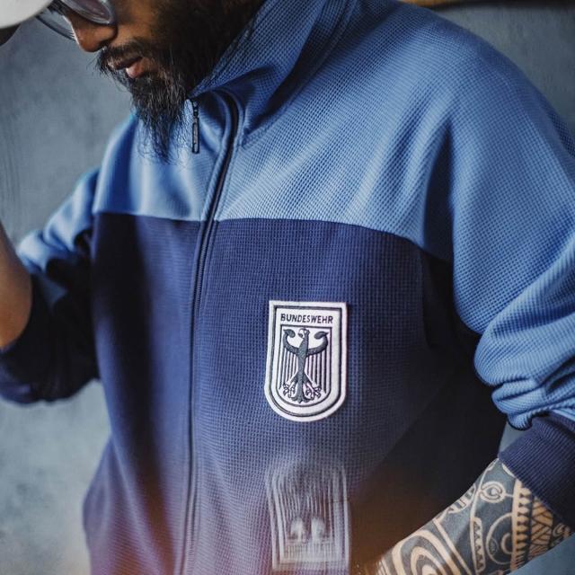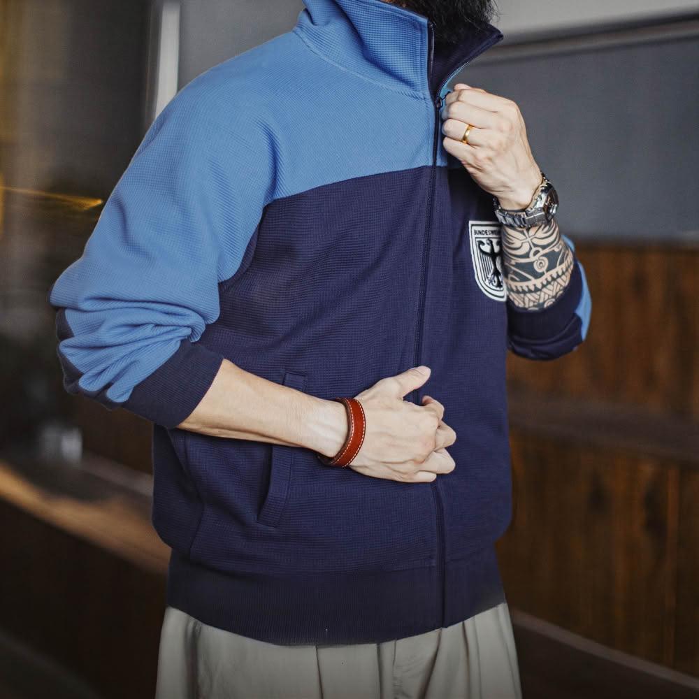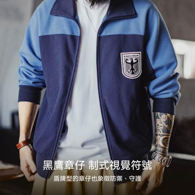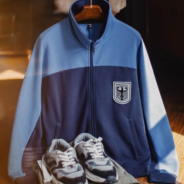 馬登工裝美式撞色教練夾克華夫格立領藍色訓練服透氣長袖外套男秋