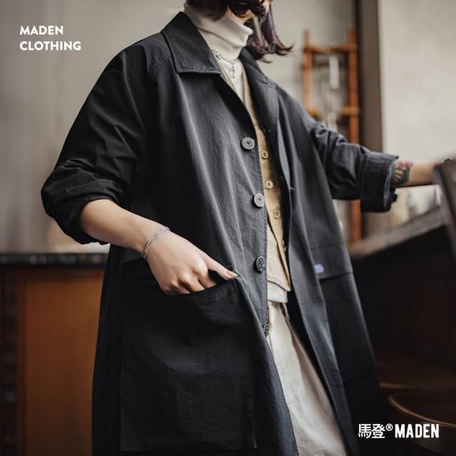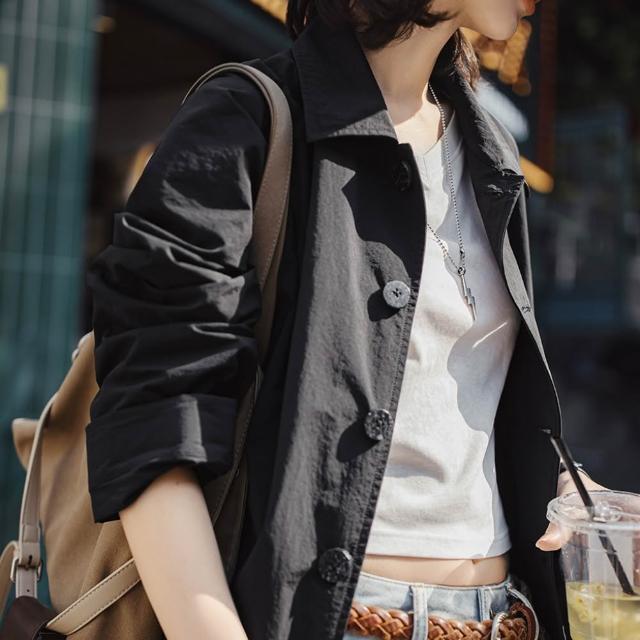 馬登工裝黑色翻領寬鬆中長薄款大衣高個子休閒工裝風衣外套女士早秋季