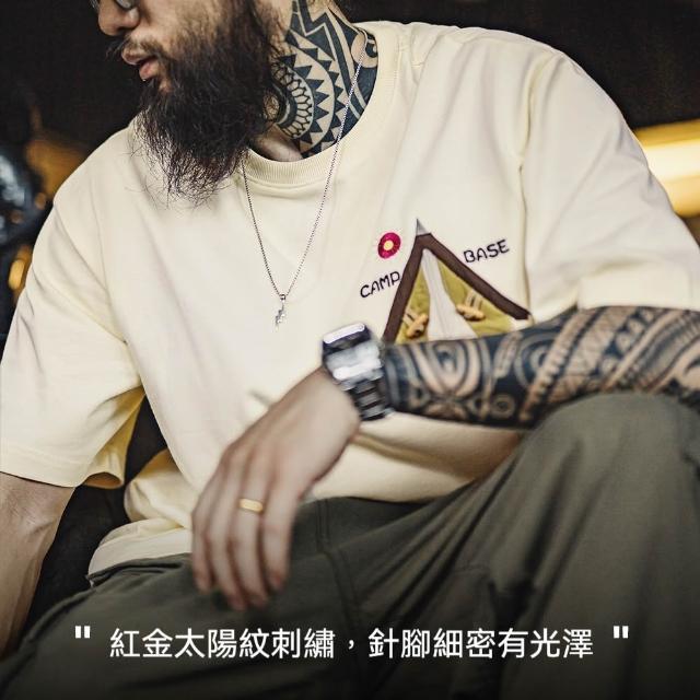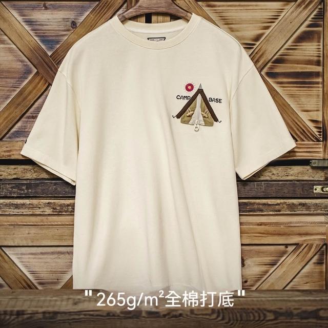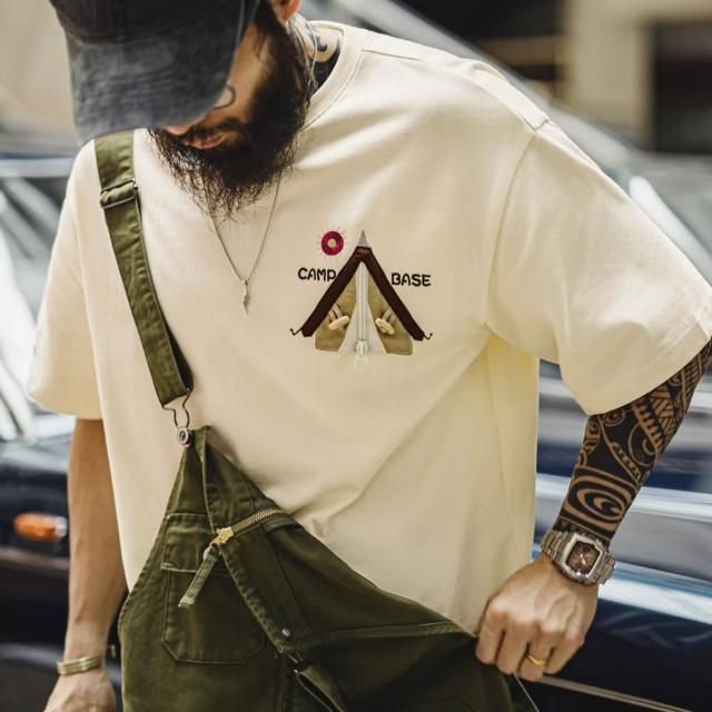 馬登工裝美式創意刺繡T恤米白色純棉重磅半袖螺紋領口短袖男夏季