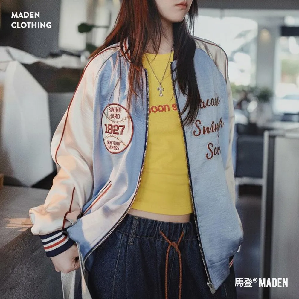 馬登工裝美式復古寬鬆橫須賀重工刺繡棒球服領夾克緞面開衫外套女士秋