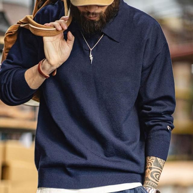 馬登工裝美式休閒海鷗polo領衛衣老錢風灰色針織長袖polo衫男秋季