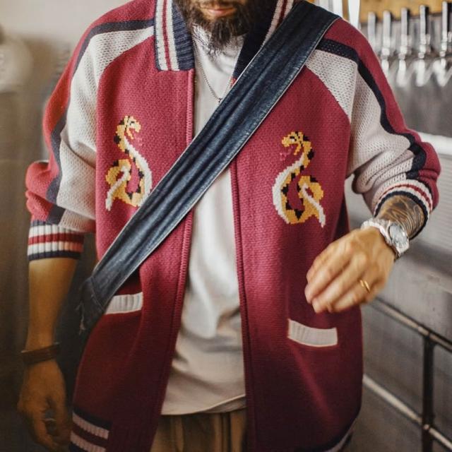 馬登工裝美式橫須賀刺繡夾克日系紅色棒球領毛織垂感開衫外套男秋