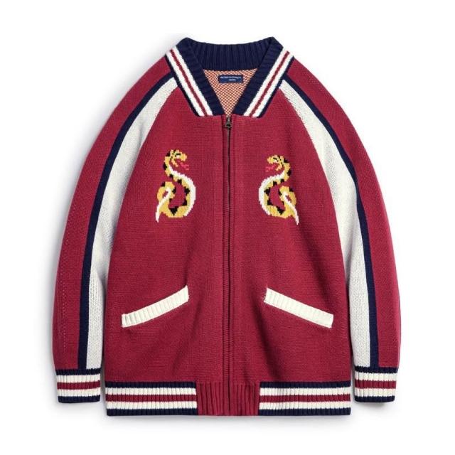 馬登工裝美式橫須賀刺繡夾克日系紅色棒球領毛織垂感開衫外套男秋