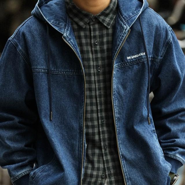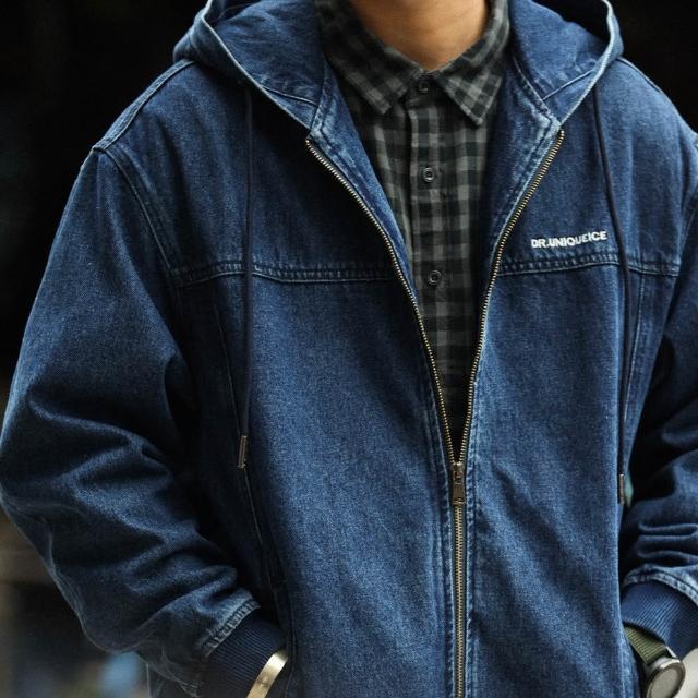 美式休閒連帽牛仔外套男寬鬆丹寧水洗重磅拉鍊工裝夾克