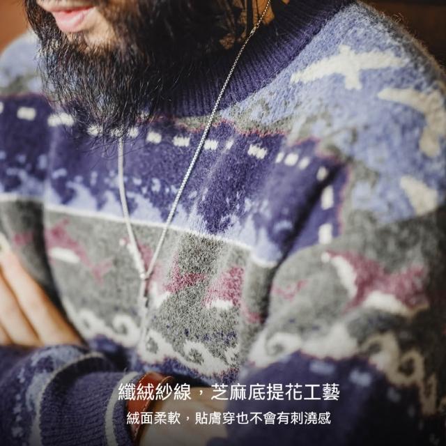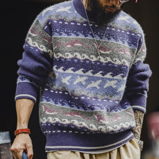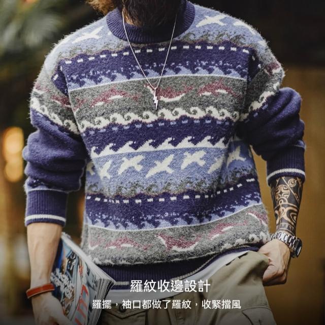 馬登工裝美式復古費爾島毛衣圓領套頭加厚寬鬆保暖外穿針織衫男冬
