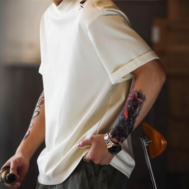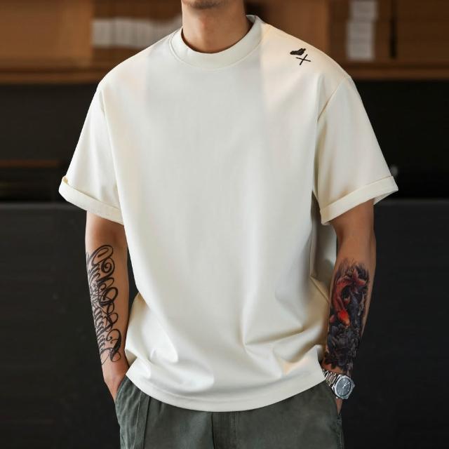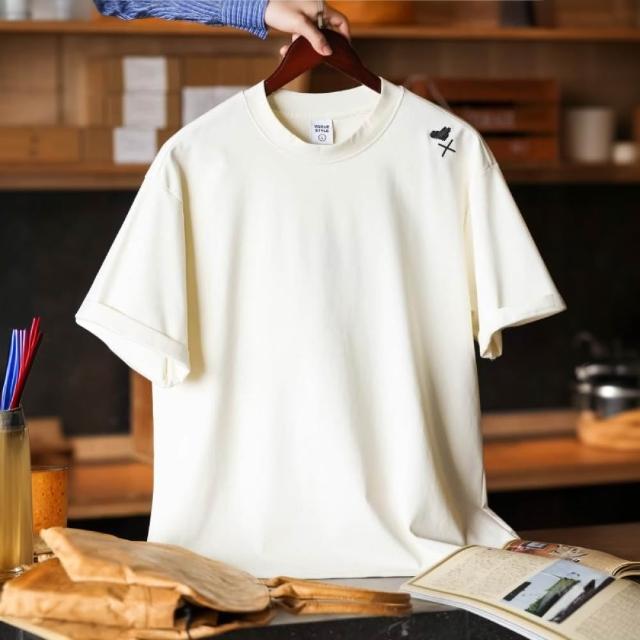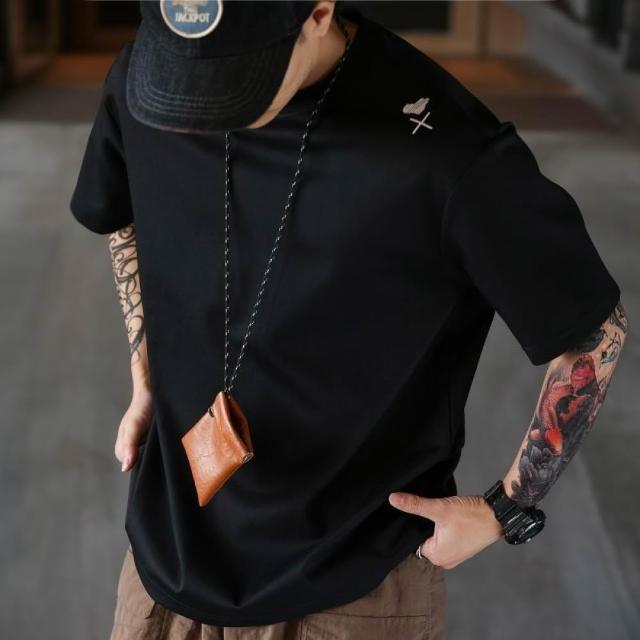 馬登工裝美式休閒愛心刺繡短袖T恤男寬鬆落肩袖簡約圓領打底TEE