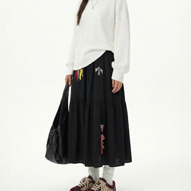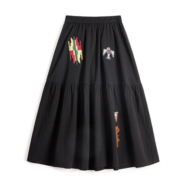 馬登工裝黑色復古鬆緊腰刺繡花A字過膝大裙擺半身長裙拼接裙子女士春