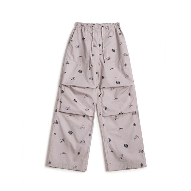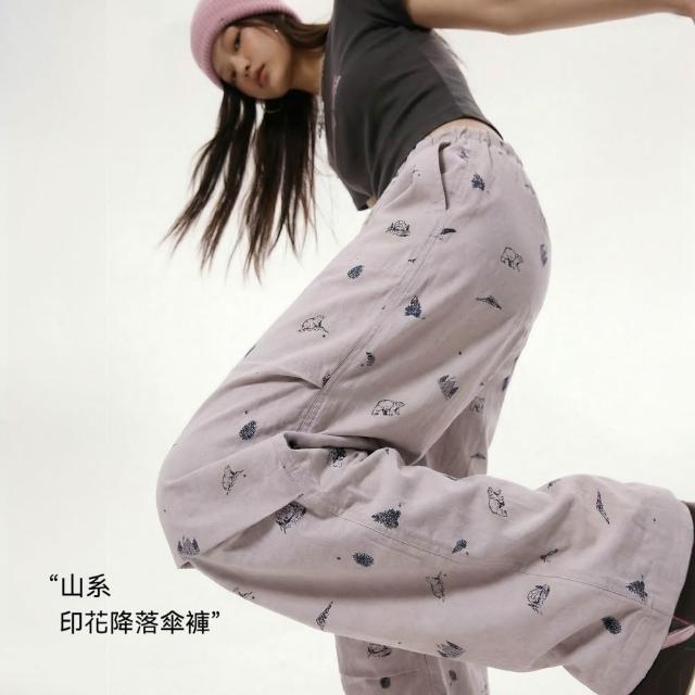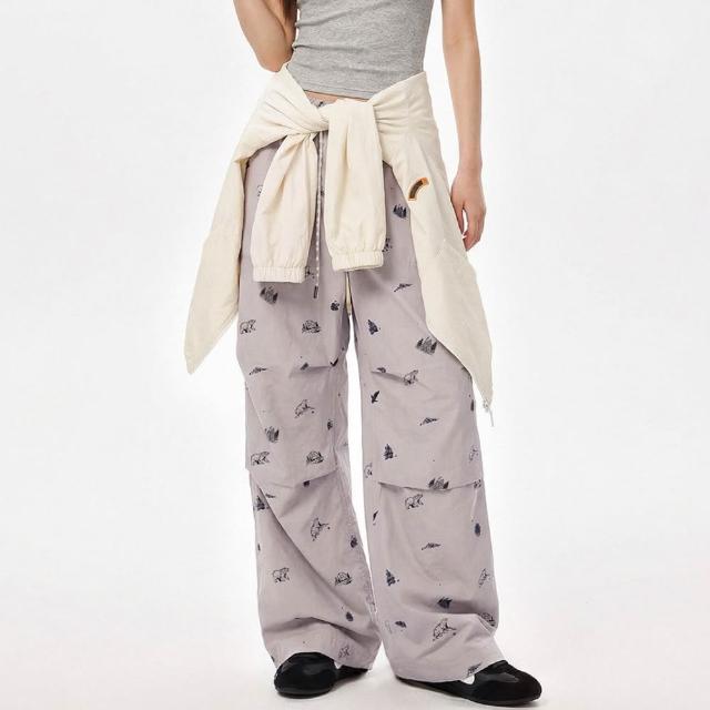 馬登工裝純棉薄款直筒闊腿山系傘兵褲鬆緊腰印花休閒工裝長褲子女士春