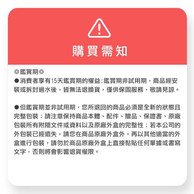 - 商品到貨享十天猶豫期之權益(注意!猶豫期非試用期),依法辦理退貨商品必須是全新狀態且包裝完整(包含主機、附件、內外包裝、隨機文件、贈品等)。如商品一經拆封或使用致商品價值受損(例僅得以福利品出售),商店將向消費者就商品一部或全部價值減損收取適當之費用(回復原狀、整新費),否則將影響退貨的權限。請先確認商品正確、外觀可接受,再行開機/使用,以免影響您的權利,祝您購物順心。
