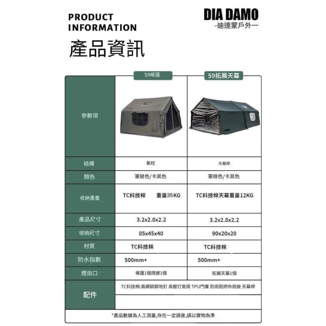 DIADAMO 迪達蒙 S9 露營科技棉充氣帳篷含拓展天幕