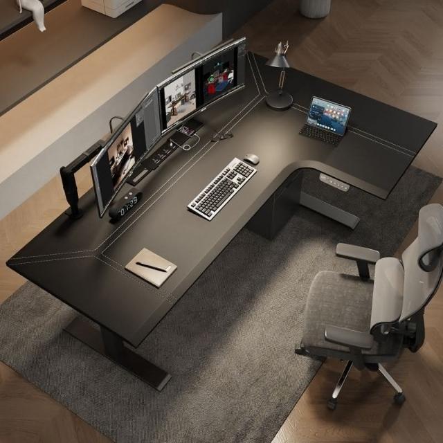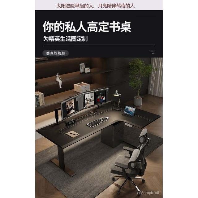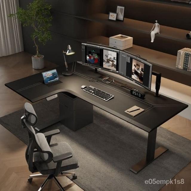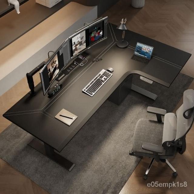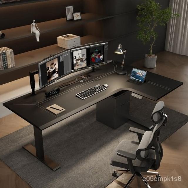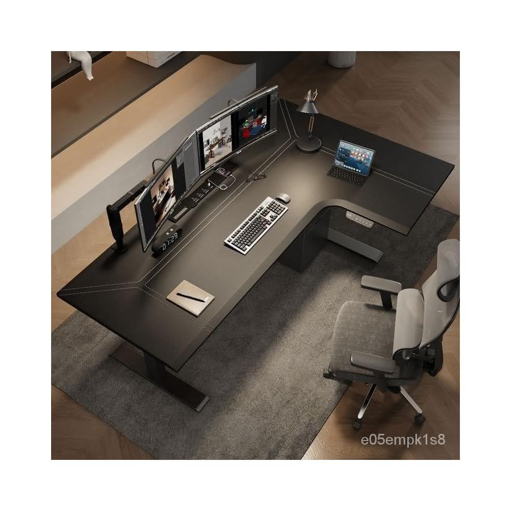 /轉角電動陞降桌l型拐角皮麵工作臺書桌家用電競電腦桌實木辦公桌
