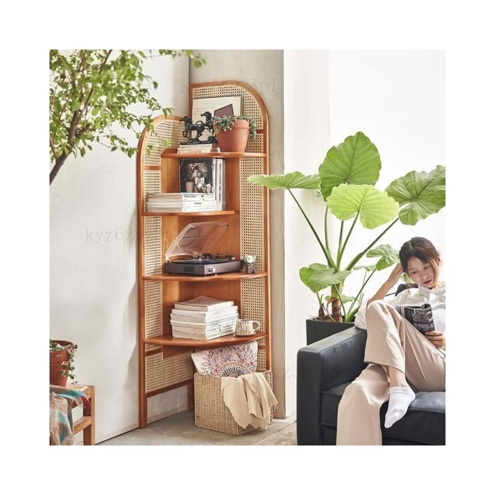 北歐實木三角櫃可移動三角形書架複古藤編轉角櫃扇形墻角置物架