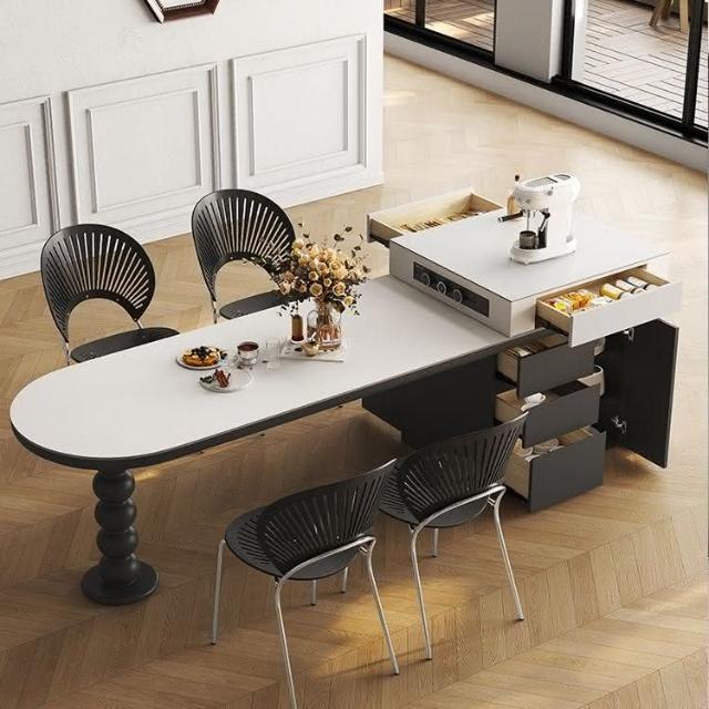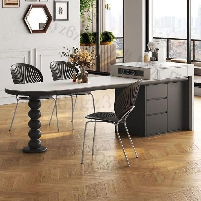 法式複古可伸縮島臺餐桌一體多功能傢用小戶型圓弧島臺巖闆餐桌椅