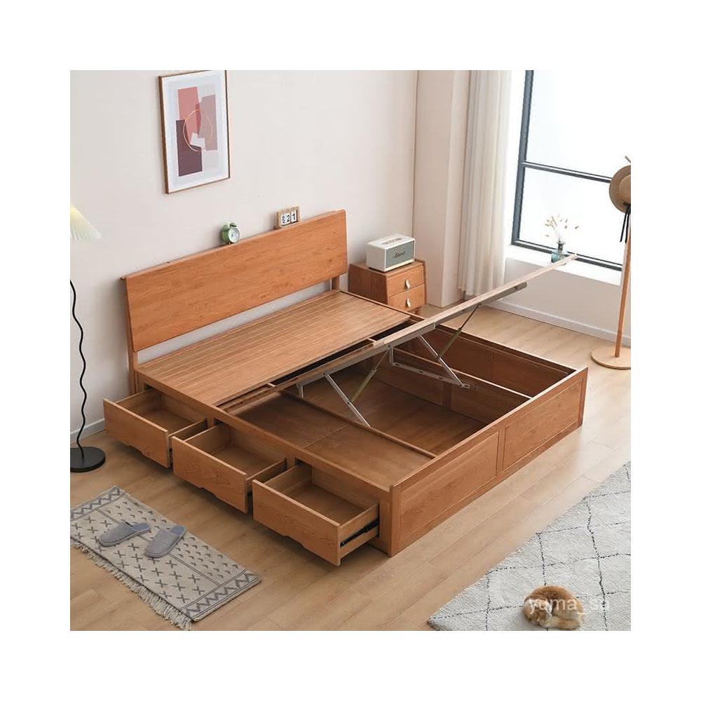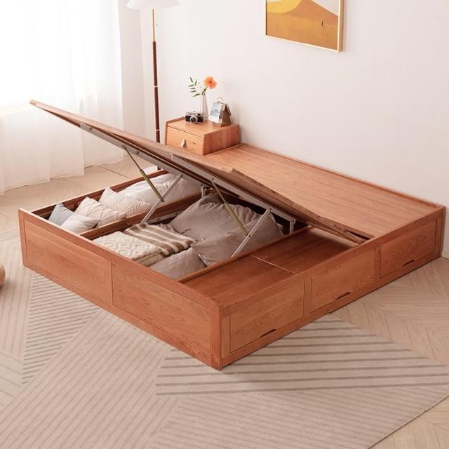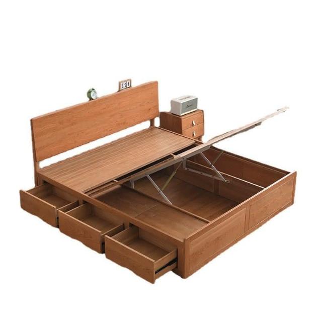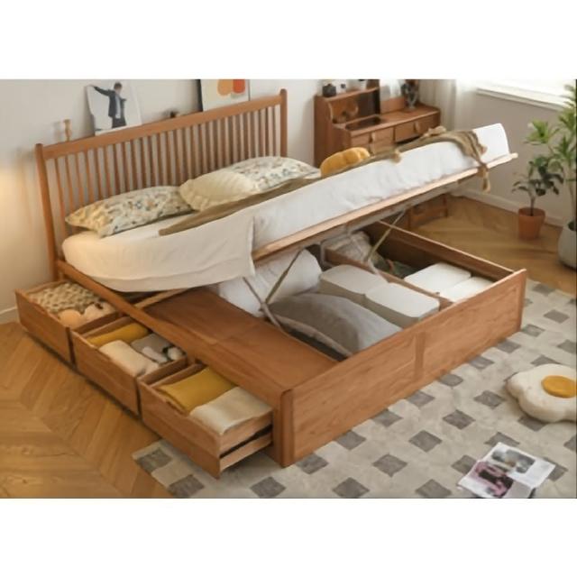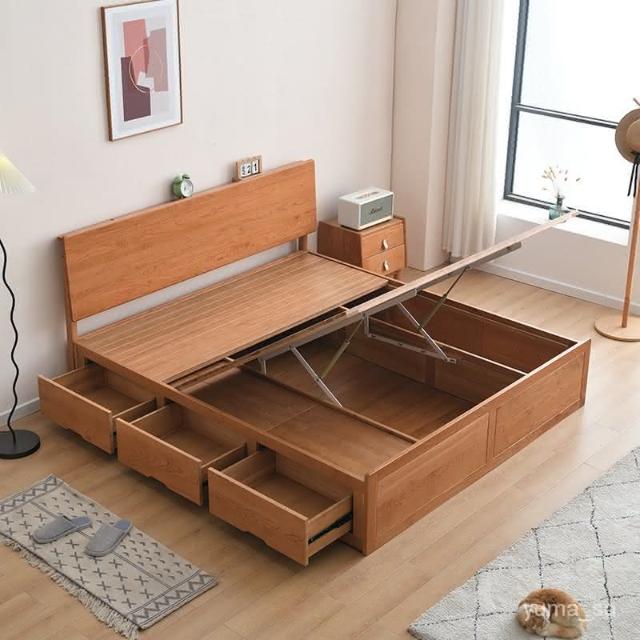 免運 櫻桃木實木床北歐抽屜收納儲物高箱床1.5米主臥床1.8米雙人床包郵床架 床組 雙人床 掀床 多功能儲物床 大床 U