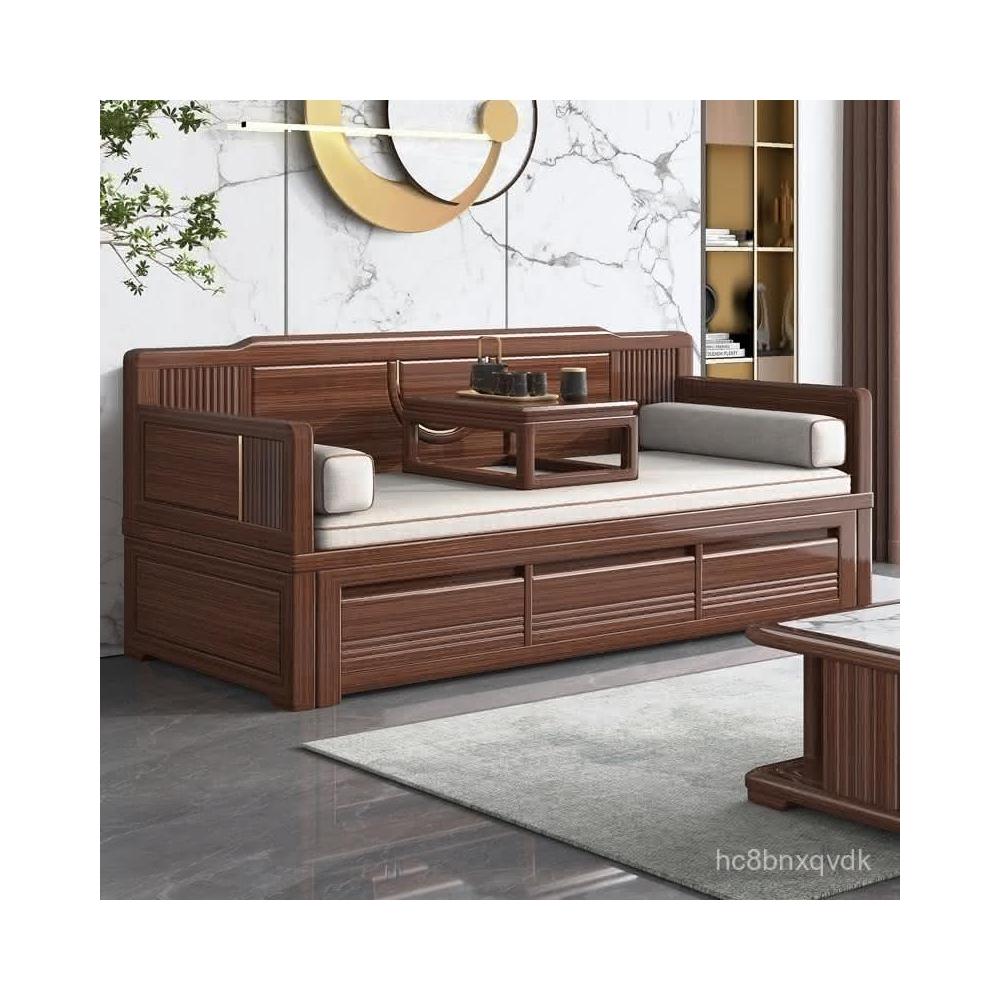 創美 實木羅漢床新中式紫金梨木大小戶型客廳推拉伸縮沙髮床兩用羅漢榻