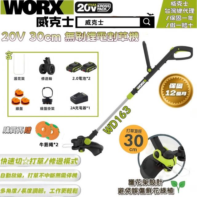 WORX 威克士20V 30cm 割草機 手持式剪草機 電動打草機 修邊機 除草機 無刷鋰電打草機 無刷鋰電割草機 修剪 園藝 雜草修剪 雙2.0電池 WD163