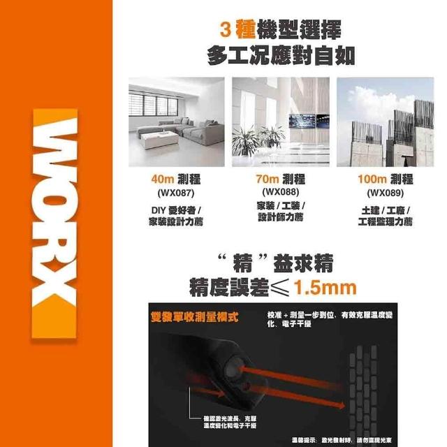 WORX 威克士40M 激光 坪數 鐳射 探測儀 水平儀 電子尺 測量尺 測距儀 雷射儀測距儀 可測平方公尺 台灣定制版 WX087.1