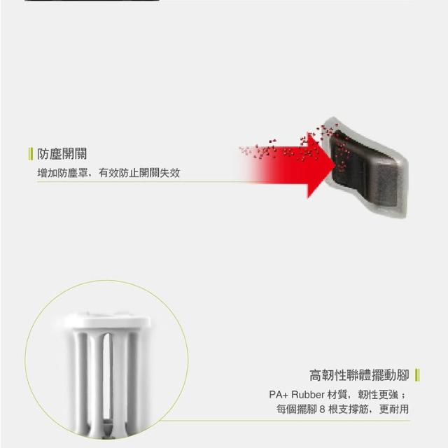 - 防塵前置開關,連體擺動腳