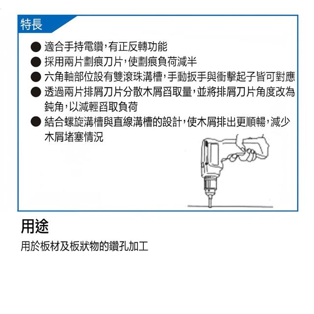 - 鑽頭尖端螺牙設計,效率佳且穩定