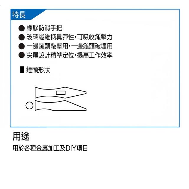 - 玻璃纖維柄具彈性,可吸收鎚擊力