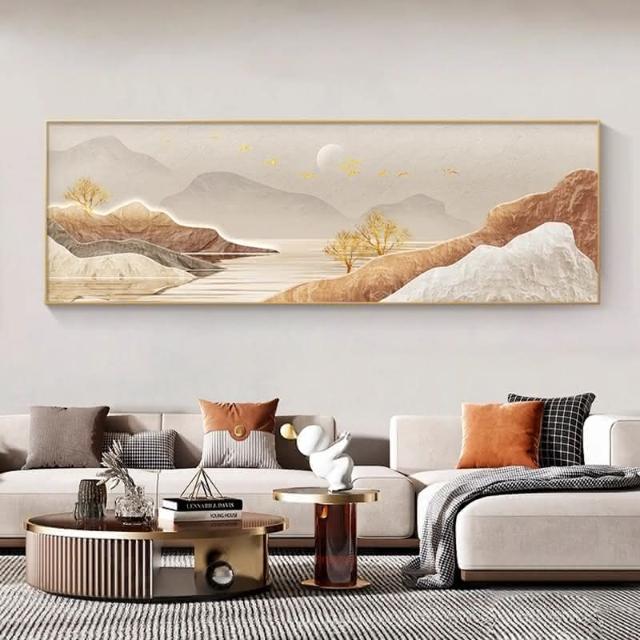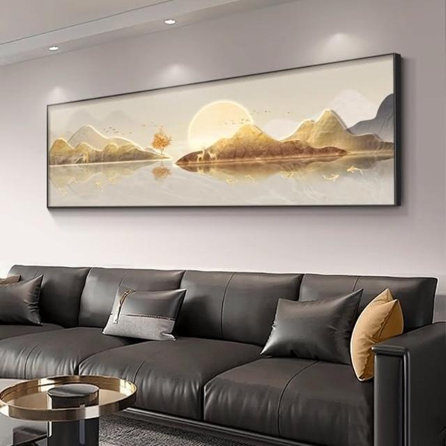 旭日東昇山水畫客廳裝飾畫 一整幅日出靠山壁畫 橫版沙發背景牆掛畫